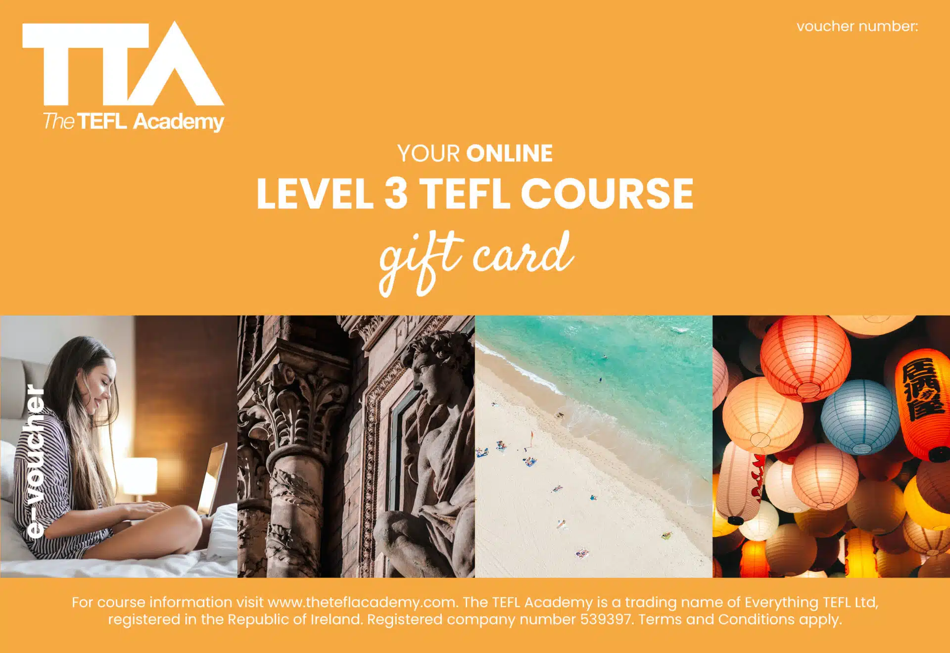Buy a PDF Online Level 3 TEFL Course Gift Voucher for family or friends. It’s the perfect gift for anyone wanting to qualify to teach English abroad and get paid to travel.